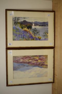 *Local Interest* Edward G Hobley (British 1866 - 1916) A pair of watercolours, the first depicting a bouquet of pheasants amongst heather on a fellside, the second Bluebells on the shore of Ullswater, signed lower right and left, within card mounts and moulded frames, under glass 34.5cm x 22cm & 48.5cm x 36.cm overall.