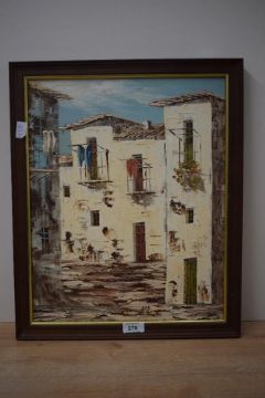 A 20th century continental impasto oil on canvas, street scene, initialled 'HS' lower centre, within moulded frame, 31.5cm x 40cm & 37cm x 45cm overall.
