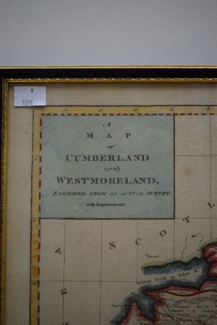 A hand colourised map depicting Cumberland and Westmoreland, inscribed 'Engraved from an Actual Survey with Improvements' attribution to lower margin reads 'London, Engraved for J.Harrison, 115, Newgate Street, As the Act directs, 13 Jan 1790' printed details from vendor verso, within moulded frame, under glass 37cm x 49.5cm & 39cm x 52cm overall.