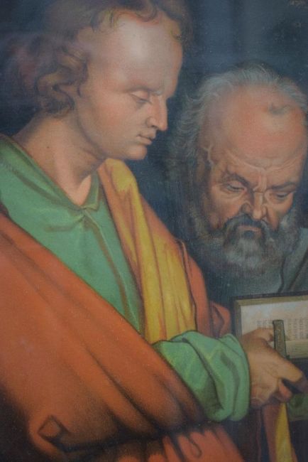 After Albrecht Durer (German 1471-1528) and C.Shultz (19th Century) A pair of Chromolithographs 'The Four Apostles', mimicking the original these prints are placed together to form a diptych, printed by Englemann and Graff Arundel Society, entitled and attributed with printing details verso, within gilt slips and moulded frames, under glass 18cm x 50cm & 30cm x 62cm overall.