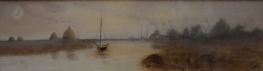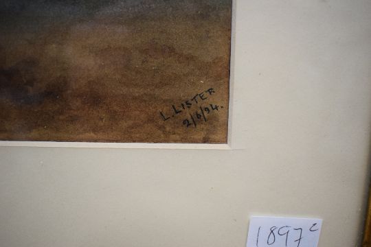 L Lister (19th Century) a pair of watercolours, the first a pastoral scene with cottage and the second a costal scene with sailing boats, signed and dated (1894) lower right, within card mounts and moulded gilt frames, under glass 34cm x 10cm & 50cm x 26cm overall.