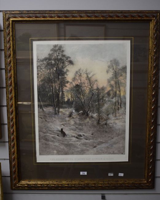 After Joseph Farquharson (Scottish 1846-1935) reproduction colour print 'The Shortening Winter Day is Near a Close' originally printed in 1898, within a gilt lined card mount and rope-twist moulded gilt frame, under glass 65cm x 50cm & 97cm x 80cm overall.