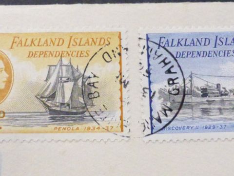 FALKLAND ISLANDS 1959 BASE Y, MARGUERITE BAY POST OFFICE DUO OF COVERS Duo of covers from Marguerite Bay Post office (Base Y) from the late 1950's. One with illustrated King Penguin and British Antarctic Base Y Cachet, sent locally. The other cover sent registered to the UK. Fine Duo