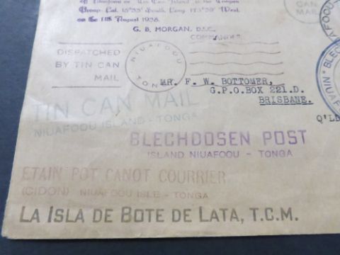 TONGA 1938 TIN CAN MAIL COVER WITH MULTIPLE CACHETS TO FRONT AND REAR Fine cover from Tonga, dating August 1938, Tin Can Mail with 2 1/2d ultramarine value tied with Niuafoou single ring cancel, further 8 cachets to front along with further 8 to rear. Fine cover previously unopened.