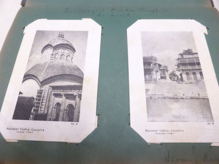 POSTCARDS: CALCUTTA, DARJEELING, INDIA, EVEREST 1914-19 COLLECTION OF CARDS Album with around 80 postcards, which for the most part is also written up with largely a collection of cards from old Colonial Calcutta (Kolkata). Various scenes including Chowringhee, the Old Court House, Burma Bazaar, Chitpore Road, Black Hole, Indian Palanquin, General Post Office, Banian Tree Botanical Gardens, Eden Gardens, Jain Temple, General Hospital, Howrah Station, The Race Course and much more to rear Darjeeling and views of Everest including Mahanadee Railway Station, Loops on railway, Hindu Burning Ghat and more. Viewing recommended on this lot.
