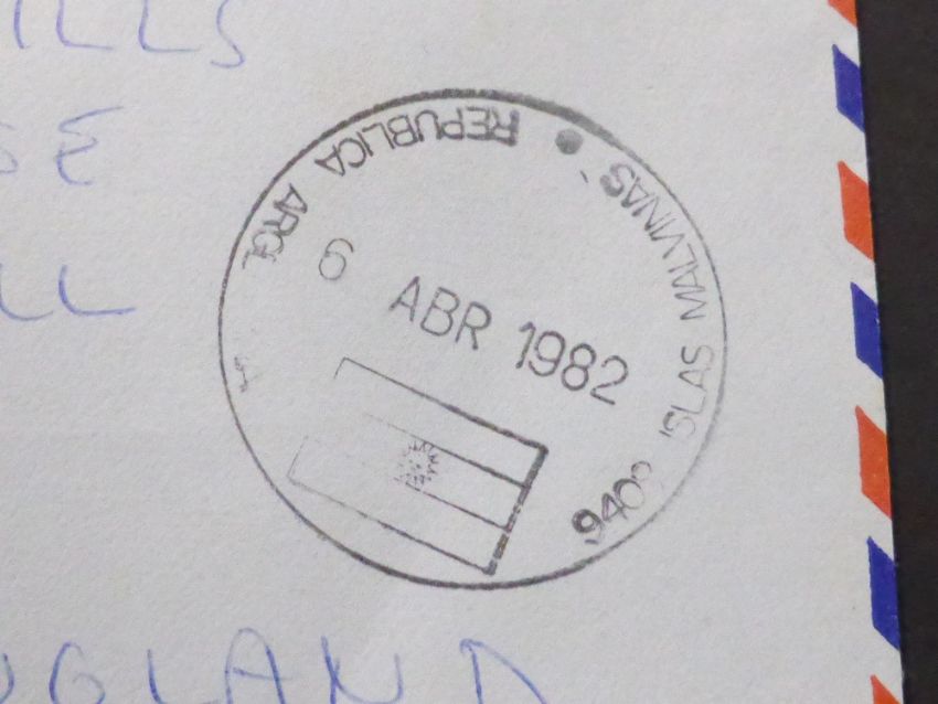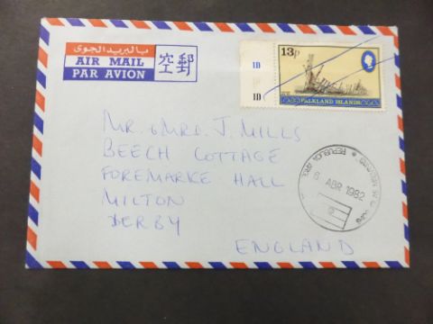 FALKLAND ISLANDS 1982 ARGENTINE OCCUPATION AIRMAIL COVER On the 2nd April 1982, Argentina invaded the Falkland Islands and the Post Office at Stanley was taken over by Argentinian staff, on the 5th April the post office was re opened but Argentinian stamps were not available until the 8th. This airmail envelope from the Conflict, sent to the UK bears the 13p ships, crossed by two biro strokes with with type I (flag at foot) ''6 ABR 1982'' Argentinian Occupation c.d.s. Below. Some rusting to edge of stamp noted, but still a fine piece of modern postal history. Envelope still has correspondence within.