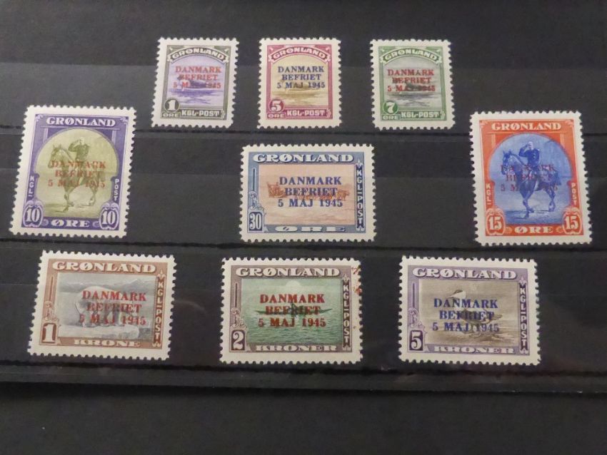 GREENLAND 1945 LIBERATION OF DENMARK OPTD SET OF 9 ALL UNMOUNTED MINT Probably the most difficult issue to obtain from Greenland, this set of 9 with opts and in this case all unmounted mint. A fine and elusive set.