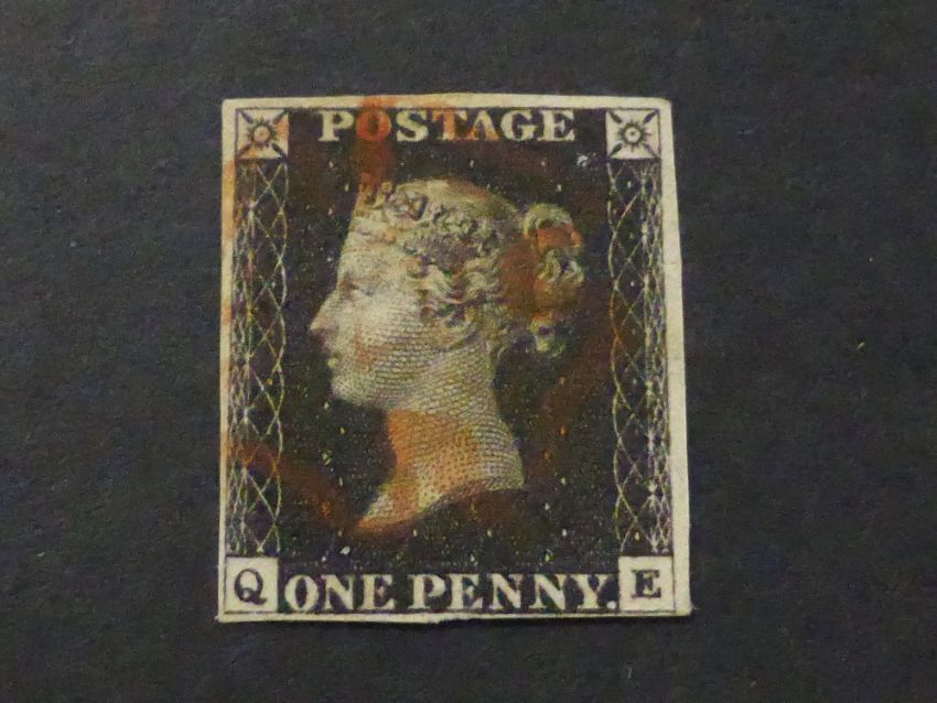 GREAT BRITAIN 1840 1d BLACK 4 MARGINS CORNER LETTERS QE, RED MALTESE X CANX Card with 4 margin black corner letters QE, three good margins, margin to bottom edge average and close to frame in places. Value tied with red maltese Cross Cancel.