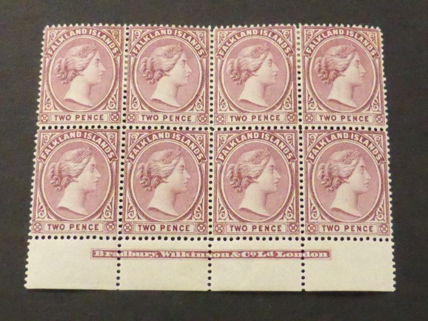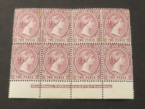 FALKLAND ISLANDS 1895 2d PURPLE IN MARGINAL BLOCK OF 8 WITH PRINTERS DETAILS Fine block of 8 (mounted to top two values only, otherwise unmounted mint) of the 2d Purple from 1895 onwards. Marginal item with printers ingress details to bottom (bradbury). We don't see multiples of this nature too often.