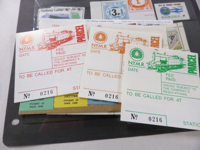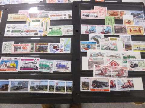 GREAT BRITAIN: RAILWAY STAMPS MNH COLLECTION ON 7 PAGES + SHEETLETS ETC 7 pages of hagner sheets, with fine MNH railway letter fee stamps collection. Various Railways from around Britain seen, including North Yorkshire Moores, Bluebell RH & DR, various Welsh etc. All laid our largely by sets, surcharges etc noted. Further sleeve or around 20 or so mini sheets/sheetlets/odd multiples.