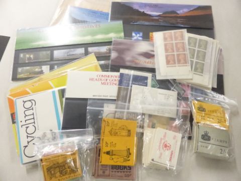 GREAT BRITAIN BOOKLETS, YEAR PACKS, PRESENTATION PACKS ETC IN BOX Chiefly GB (although we do note odd Ci's) eclectic collection of buts and pieces! Panes of 6 by plate of the first Machins, early 70's year packs ranges of 2/- booklets in bags, wildings in stockcards (some identified). Odd newer pres packs.