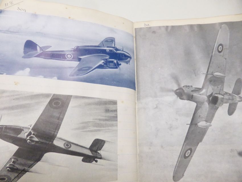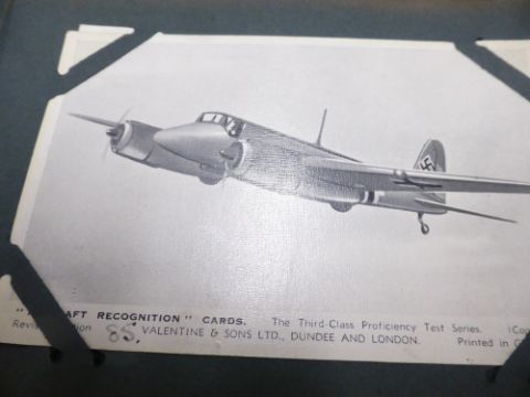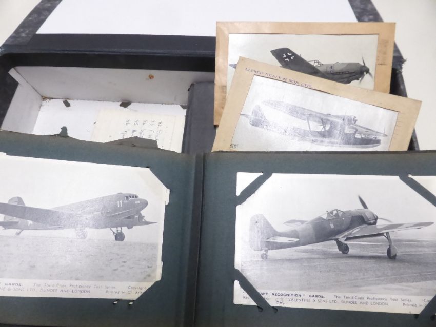POSTCARDS & ALBUM OF WAR PLANES - VALENTINES AIRCRAFT 'RECOGNITION' CARDS Box file with album of postcards all appear to be Valentines Aircraft 'recognition' series, in total around 50 cards with exception to one, in colour the others are Black and white. Second album is a home made album entitled Aircraft of the Fighting Powers 1939-44 with fascinating compilation of 500+ pictures (cutouts from papers, old cigarette cards, and flight copyright material along with extensive notes to rear again a mix of press cuttings etc)