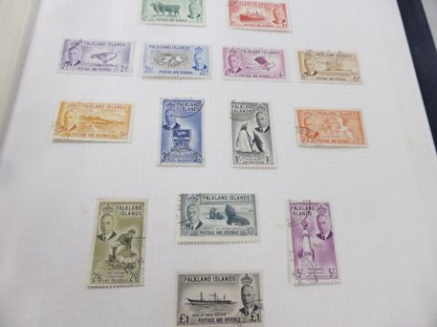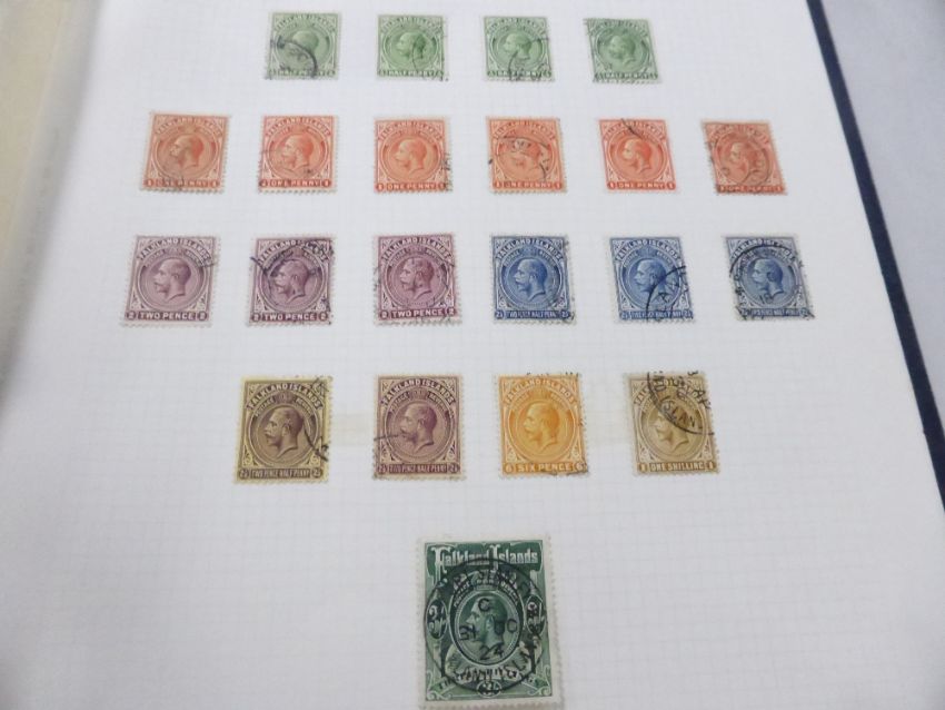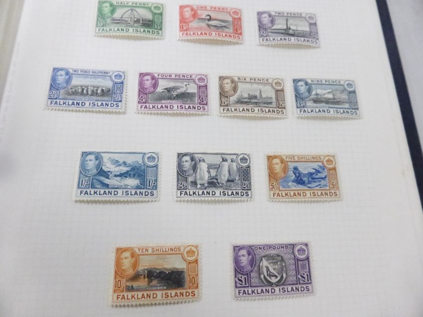 FALKLAND ISLANDS 1879-1982 MINT AND USED COLLECTION IN ALBUM A very attractive Falkland Islands collection in Plymouth (2 peg) album. Material ranging from 1878 issue with shades and values to 1 shilling There after definitives from 1883, all laid out by shades etc, war tax issues (mint and used), 191 definitives to 3 shillings, 1929 definitives to 2 shillings and sixpence, 1933 centenary set mint to 1 shilling, GVI 1938 set to £1, along with later variations, mint and used to 2/6-. The 1952 GVI issue used to £1 (full set). QEII sees 1960 issue mint to £1. Looks there after complete to 1982. Latterly mint, but some odd 60's are fine used as are bits of the 70's. Viewing recommended.
