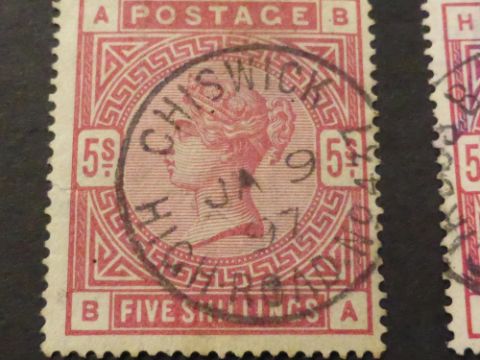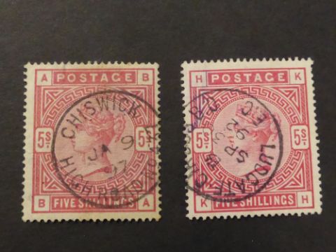GB 1883 5 SHILLING ROSE & CRIMSON (SG180/81) BOTH FINE USED WITH CDS's Lovely pair of 5 shilling values from the 1883 issue. Value to left the Rose variant with fine Chiswick CDS to middle and value to right is the Crimson with Ludgate CDS.