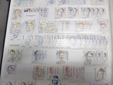 WORLDWIDE BOX OF COLLECTIONS, STOCKCARDS, PACKETS, LEAVES ALBUMS ETC Box with various worldwide collections noted with strength in US. 13 volumes in all of stockbooks, with various, then at bottom of box a complete 'mess' of stockcards, leaves, packets etc.