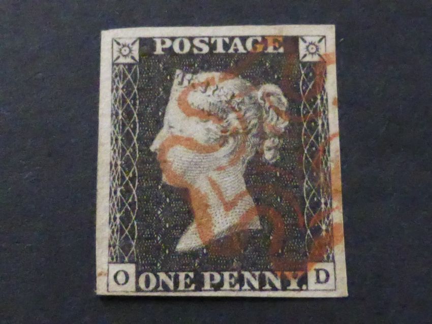 GREAT BRITAIN 1840 1d BLACK 4 MARGINS CORNER LETTERS OD, RED MALTESE X CANX Card with 4 margin black corner letters OD, three good margins, margin to bottom edge average. Value tied with red maltese Cross Cancel.