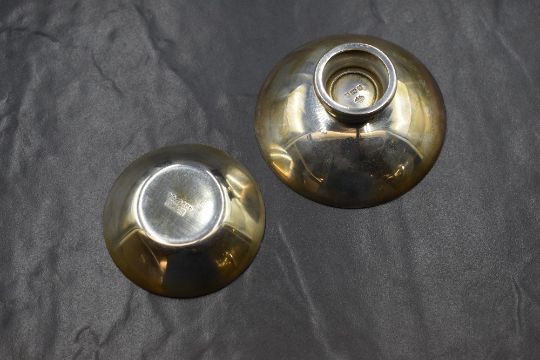 A late Edwardian silver and guilloche pedestal pin dish, having dark green guilloche enamel and gold decoration to the bowl, marks for Birmingham 1910, maker William Hutton & Sons Ltd, along with a Norwegian David Andersen silver and guilloche enamel pin dish, having blue guilloche enamel to the bowl, marked DA 925S Norway, 115g gross