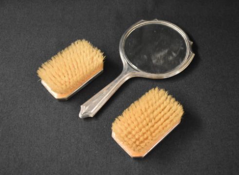 A pair of Elizabeth II silver mounted clothes brushes, having engine turned decoration and initial, marks for Birmingham 1972, maker Charles S Green & Co Ltd, along with a silver mounted hand mirror also having engine turned decoration and 'C' initial, marks for Birmingham 1921, maker Docker & Burn Ltd