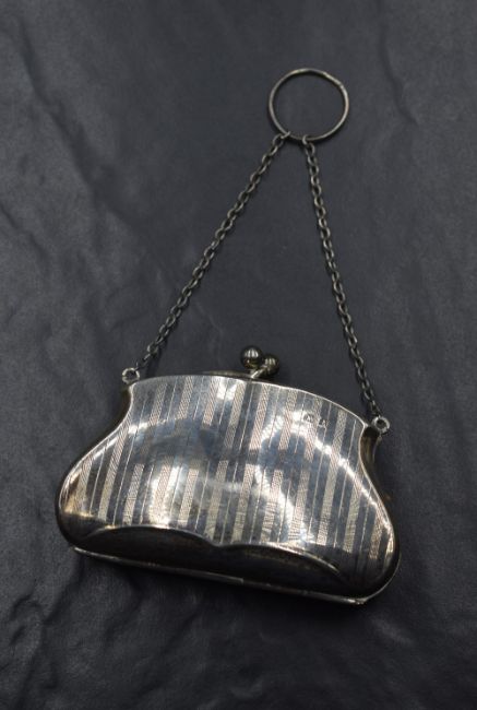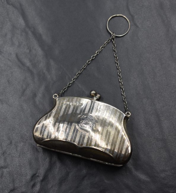 A George V silver purse, having engine turned decoration and monogram engraved to a circular cartouche, with fitted interior, marks for Birmingham 1918, maker G Norman, 60g
