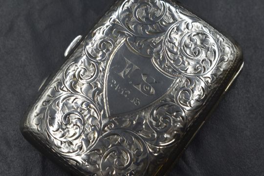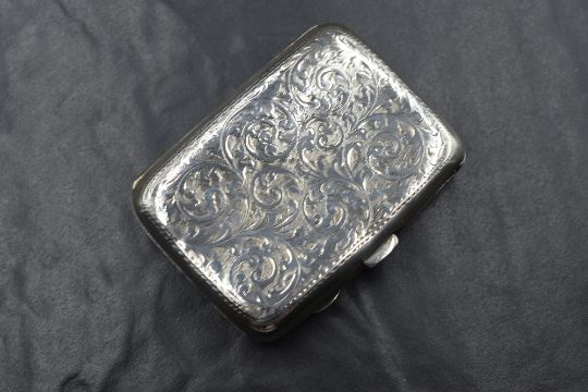 A George V silver cigarette case, of hinged rectangular form having scroll decoration with a central shield cartouche engraved 'F.S 24.12.13', marks for Birmingham 1912, maker Joseph Gloster Ltd, 8.5cm x 6cm, 66g