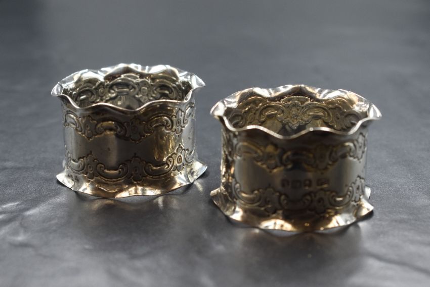 A cased pair of Victorian silver napkin rings, having flared lobed rims with decorative floral scroll engraving, marks for Sheffield 1894, maker Atkin Brothers, 49g