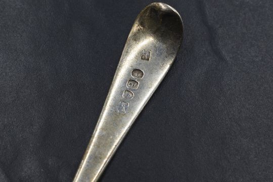 A George III silver Old English pattern serving spoon, having 'IHB' to terminal, marks for London 1791, maker Peter & Ann Bateman, along with a further silver Old English pattern serving spoon, having rubbed marks and a George V silver sauce ladle with personalised inscription to terminal, marks for Sheffield 1918, rubbed makers mark, 159g gross