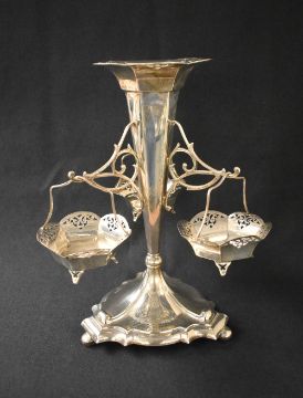A George V silver epergnes, of traditional form having a pierced flared rim over a fluted body with three scroll arms holding hanging baskets, raised on a decorative moulded base, having a personalised inscription, and three ball feet, marks for Sheffield 1916, maker James Deakin & Sons, 32cm, 1030g gross