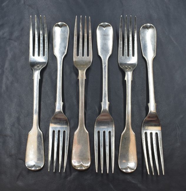 A set of six Victorian silver fiddle pattern forks, marks for London 1844, maker Chawner & Co, 278g gross