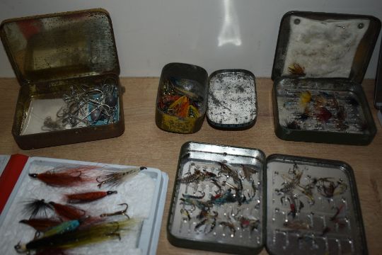 A selection of fishing flies both salmon and trout in various tins and boxes