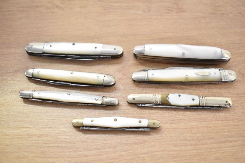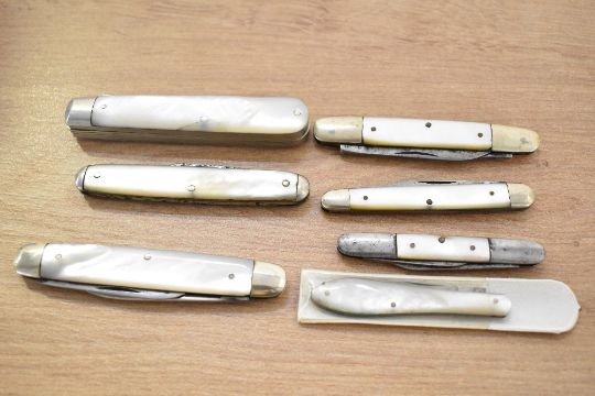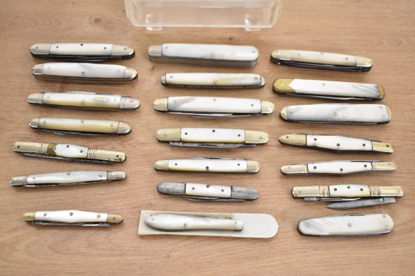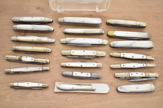 A large collection of various 19th/20th century mother of pearl bodied pen knives, the majority by Sheffield makers unless otherwise stated, most if not all of the blades being Sheffield stainless steel, to include a blade and fork example by J. Deakin and Sons; a multi-blade and scissor example by Marples and Gillott Limited; a selection of multi-blade examples by H. G. Long and Company, W. Morton and Sons, Joseph Needham & Sons, Lockwood Brothers, Sheffield Cutlery, John Wigfall & Company, and A. W. Bradshaw and Sons of Germany; together with a selection of unmarked examples, to include multi-blade knives of varying sizes, a multi-blade and scissor example, and a multi-blade and file example; sold with a clear plastic box with a metal top upon four feet, most marked to blade but not all, (approximately 21 pieces and 1 box), condition is consistent with age and use; some metal wear is visible on certain blades; all blades open, though some require a little more coaxing than others; one of the larger examples shows a slight hairline crack to the mother of pearl body.