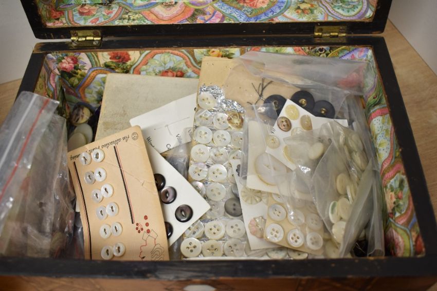 Three 19th-century wooden hinged lid boxes, to include a Tunbridge ware example, having hexagonal mother-of-pearl detailing; a rosewood and maple marquetry example, having floral and foliate detailing emanating from a mother-of-pearl disc to its lid; and a small painted marquetry-imitative box, with painted scrollwork, each having later additional floral paper-lined interiors and all teeming with an array of vintage buttons and sewing notions, (3 boxes, countless buttons and snap fasteners), condition consistent with age and use, no keys, with some visible signs of wear to inlaid marquetry detailing and scuffs and scratches to the external wood, some areas of cracking to the woodwork and occasional chipping.