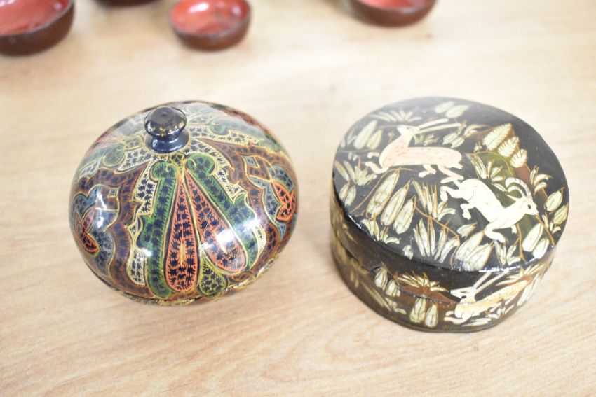A nested set of mid 20th-century Japanese wooden lacquerware bowls/saki cups with colourful red centres; sold with two decorative Anglo-Indian lacquerware boxes, all unmarked, (8 pieces), condition is consistent with age and use, large crack to largest Japanese saki bowl, overall visible surface wear to majority.