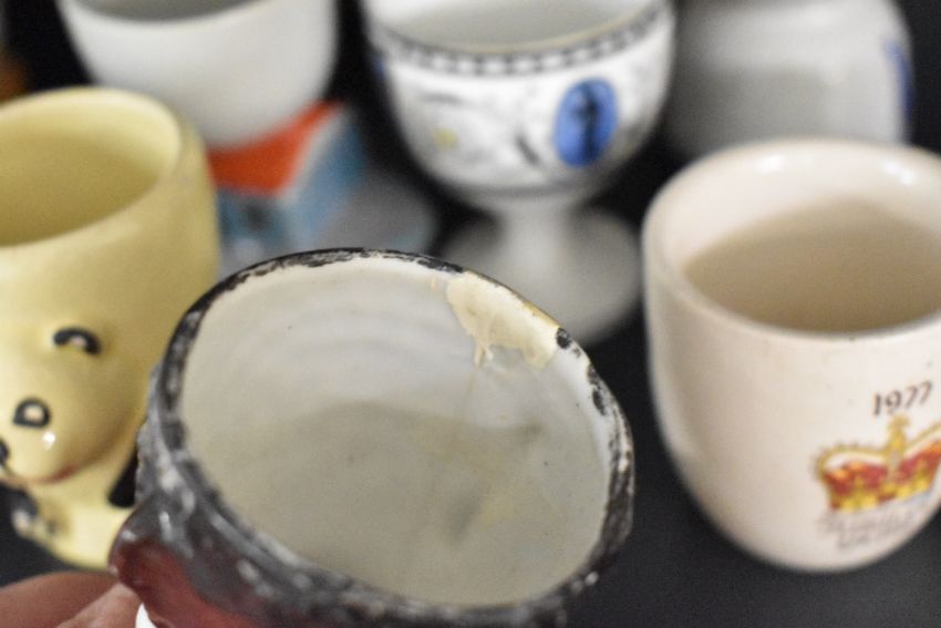 A large selection of late 19th- to 20th-century ceramic novelty egg cups, some transferware and some hand-painted, out of the more floral and foliate decorated examples there being a couple of examples from Royal Doulton, Wedgwood, Henriot Quimper, Burleighware, Royal Crown Derby, and James Kent Limited, as well as a large quantity of more novelty-designed examples, such as animals, clowns, politicians, and others, some marked to base but not all, (approximately 48), condition is consistent with age and use, some visible areas of surface wear to rims and a couple of chipped rims shown in photos.