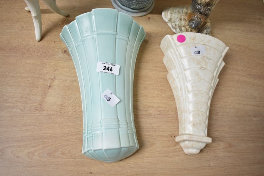 A quantity off 20th-century potteryware, to include two Burleighware Art-Deco-style wall pocket vases; a presumed SylvaC cornocopia shell-shaped vase; an Arthur Wood 'Garden Wall' vase; and a Portmeirion-style triple necked spill vase, some marked but not all, (5 pieces), condition is consistent with age and use, no visible chips, cracks or fixed damage.
