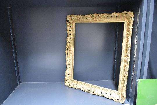 A 20th-century wooden Italian-style ornately carved gilt frame, featuring foliate and scrollwork detailing, unmarked, 56cm x 48cm, condition is consistent with age and use.