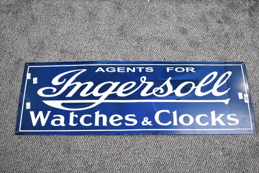 A contemporary reproduction Ingersoll Watches and Clock metal and enamel advertising display sign, 92cm x 31cm, condition is consistent with age and use, visible area of repainting to right side.