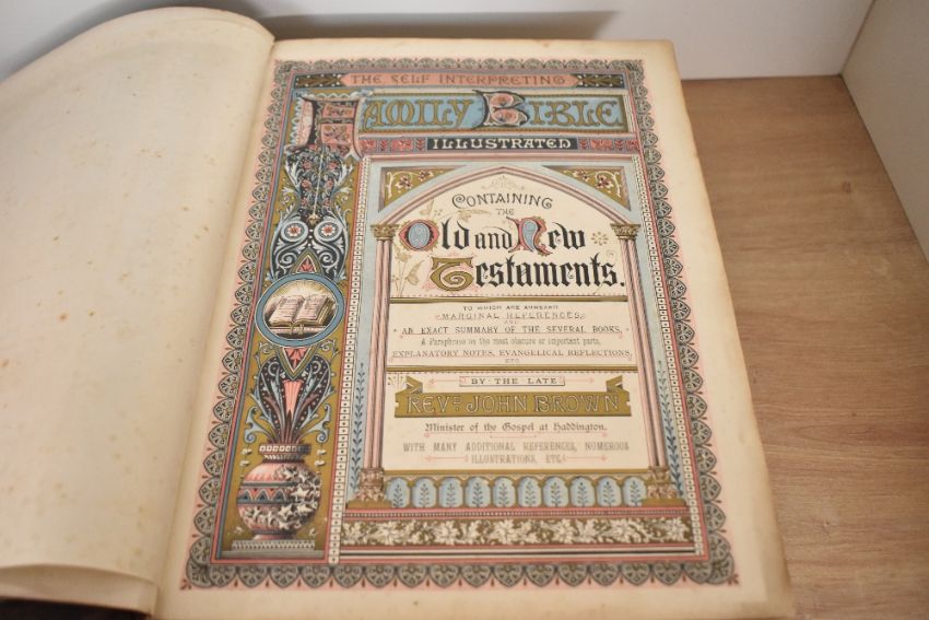A large 19th-century leather bound Rev. John Browns, of the Gospel at Haddington, Self-interpreting Family Bible containing the Old and New Testament, illustrated, and decorated with ornate brass corners and embossed foliate motifs, 33cm, condition is consistent with age and use, deterioration and damage to outside spine of book, fixed damage to front of spine, surface damage to leather and tarnish to metal corners.