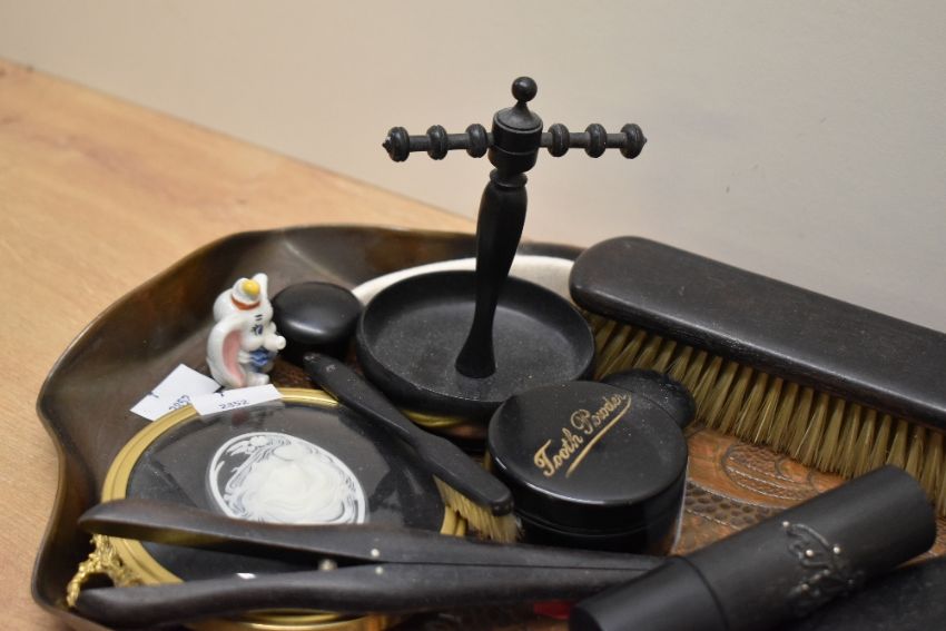 A selection of late 19th to 20th-century sundry vanity ware, to include a copper Arts and Crafts tray with a scalloped rim and hand-hammered foliate decoration; two miniature ebony screw-top boxes; a Swarovski crystal water lily candle holder; an ebony vanity set comprising brushes with natural bristles and metal monogram ‘M’ inlay; an ebony needle case; and more, (approximately 15 pieces), condition is consistent with age and use.