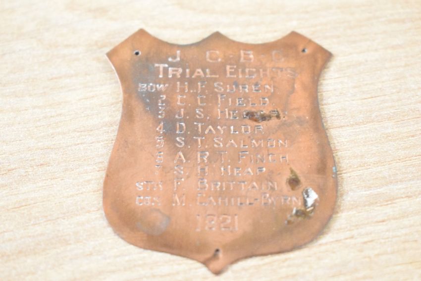 An early 20th-century American metal Special Deputy Sheriff of Kay County, Oklahoma, number 26; sold with a bronze 1921 Jesus College Boat Club (JCBC) rowing club trophy shield/plaque, listing the 'Trial Eights' event crew members, (2), condition is consistent with age and use.