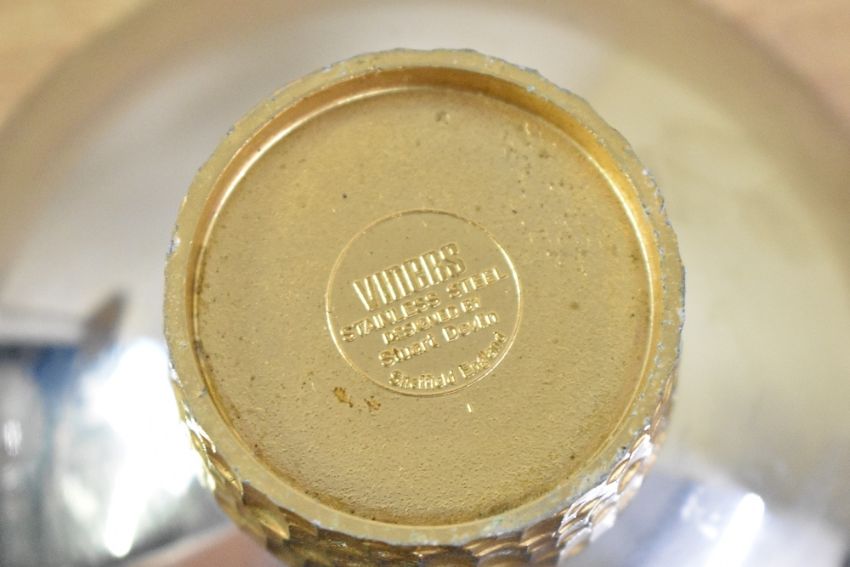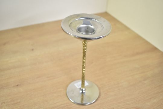 Three late 20th-century Viners stainless steel and gilt Brutalist ware designed by Stuart Devlin (Australian 1931-2018), to include a candlestick; a potpourri/posy vase and a bonbon dish, all marked to base, (3), condition is consistent with age and use.