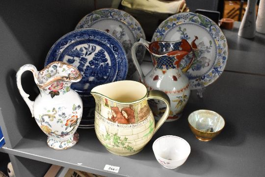 A pair of Masons ironstone transfer printed peacock pattern plates, 25cm sold together with a reproduction ironstone style water jug, a Victorian FM&Co transfer printed water jug, A Royal Doulton series ware jug, three willow pattern plates, a Newhall porcelain tea bowl (af) and a Wedgwood lustre bowl (af)