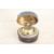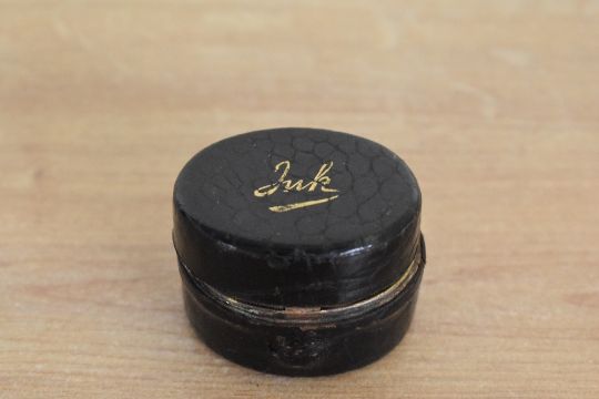 A 19th-century Austrian leather-covered brass travelling inkwell, having 'ink' in gilded scripture atop the lid and featuring an ornate engraved brass interior of foliate motifs with a spring-loaded lid mechanism, undone to reveal a small glass inkwell inside, impressed 'Made in Austria' to reverse, 4.5cm diameter and 3cm in height, condition is consistent with age and use, visible wear to leather exterior with small back section missing, small section of leather is unattatched; hinged mechanisms all in working condition; interior ink stains; metal wear/small areas of rust visible to inside section.
