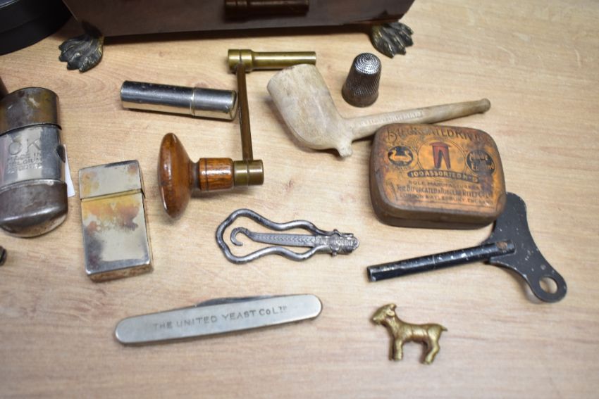 A quantity of 20th-century sundryware, to include a mahogany tea caddy of sarcophagus-form upon three paw-formed feet; a small Aylsebury Brand bifurcated rivets tin with rivets inside; a miniature Richards of Sheffield ivorine multi-tool; a metal The United Yeast Company Limited pocket-knife; The Workman clay pipe; a selection of lighters and more, (approximately 16 pieces), condition is consistent with age and use.