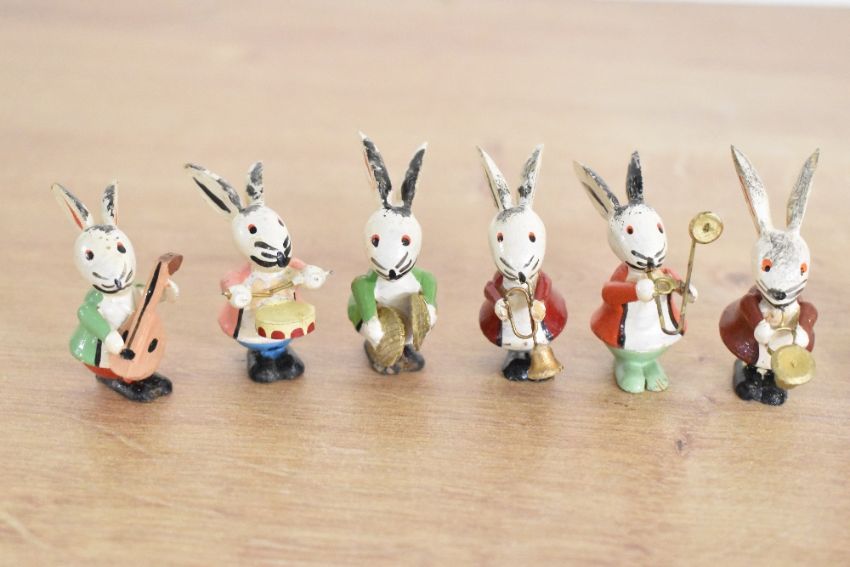 Vintage miniature wooden bunny orchestra figurines, featuring colourful hand-painted detailing, to include percussion, wind, string, and conductor examples, unmarked, (12 in total), condition is consistent with age and use.