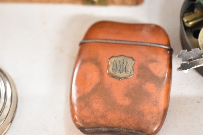 A large quantity of 19th to early 20th-century sundrywares, to include a small wooden hinged-lid box having brass foliate detailing to the exterior; a pair of Lemaire Fabi Paris opera binoculars with leather case; a large selection of metal keys with paper labels; a small metal match stick holder with 'WBC' initialled in script within a small shield; a collapsible metal drinking cup; and EveReady AM 5A/476 nickel-plated brass flashlight and more, (approximately 9 pieces and 1 metal container full of keys), condition is consistent with age and use.