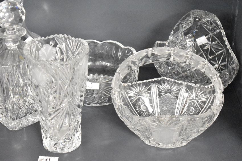 A large quantity of 20th-century crystal cut glassware, to include three decanters; a large bowl; a claret jug with a silver-plated handle/top; a vase and more, unmarked, (10 pieces), condition is consistent with age and use.