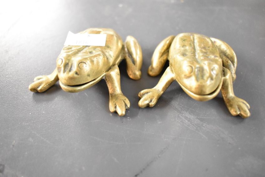A quantity of 19th to early 20th-century metal ware, to include a Victorian copper scullery kettle, featuring a brass and copper handle, a delicate acorn finial and a traditionally formed body; a brass preserving pan, having a wide mouth and iron handle; a pair of brass frogs trinket boxes; two small brass candlesticks and a brass urn-formed pot, unmaarked, (7), condition is consistent with age and use, copper kettle has a very attractive shine, visible areas of surface wear/dents, natural metal ware across all.