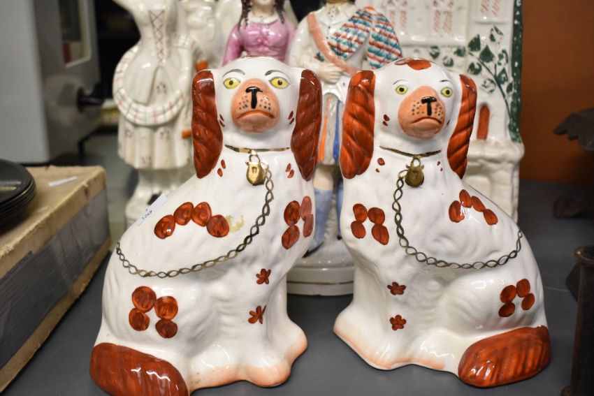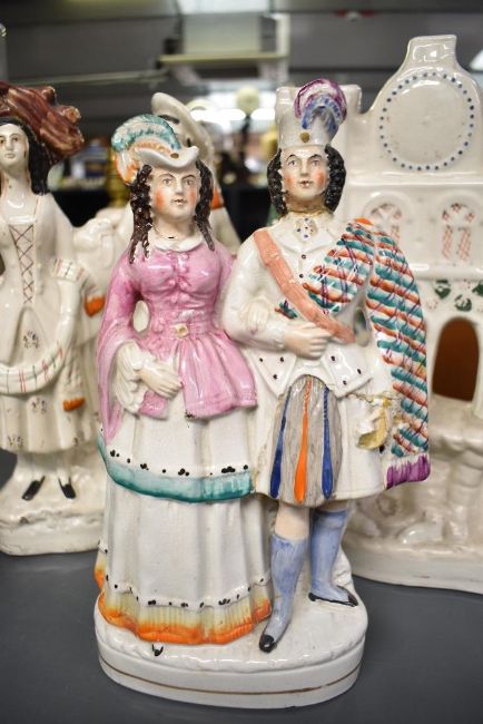 A quantity of 19th to early 20th-century Staffordshire pottery, to include a Princess Louise and the Marquess of Lorne figurine, issued around 1871 to commemorate their marriage; a flatback figurine of a couple; a flatback Baronial castle model and a pair of Red & White Staffordshire Spaniel Wally Dogs, (5 pieces), condition is consistent with age and use, significant fixed damage to both figural couples with glue residue visible, surface wear to all pieces.
