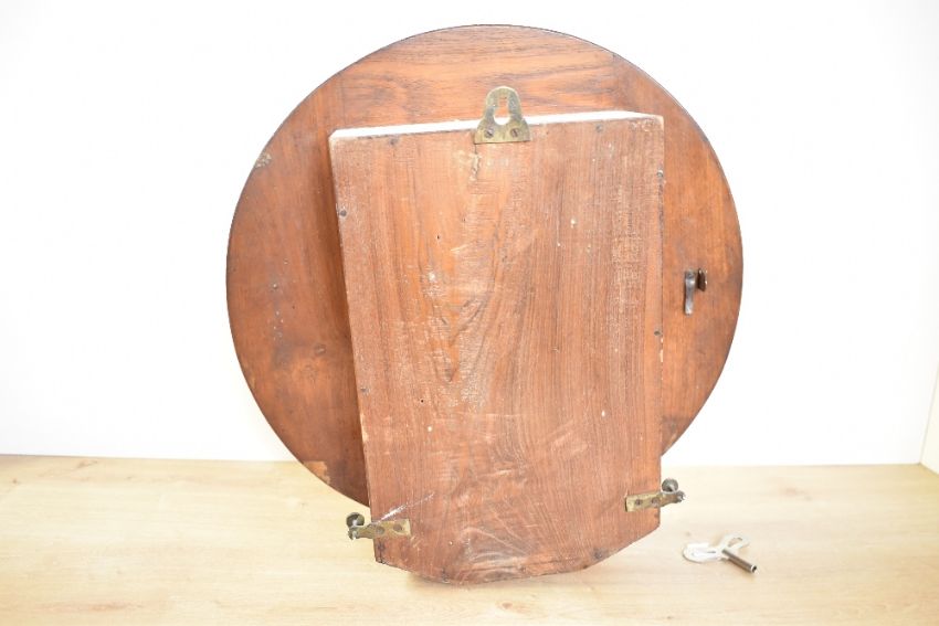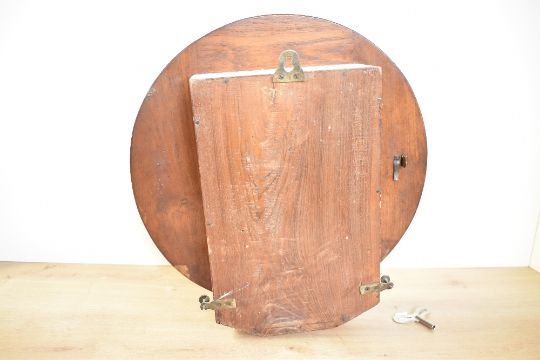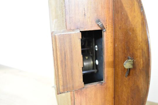 Thought to be 19th-century mahogany drop dial wall clock, featuring a cream-coloured dial with black Roman numerals, elegant spade-style hands and a hinged brass bezel, having a single barrel spring movement, cannot access back plate to attain any makers marks, 38cm diameter, condition is consistent with age and use, a key is present, slight wood discolouration to lower section, about 5cm across, with overall areas of surface wear consistent with storage.