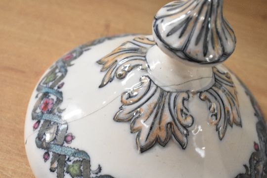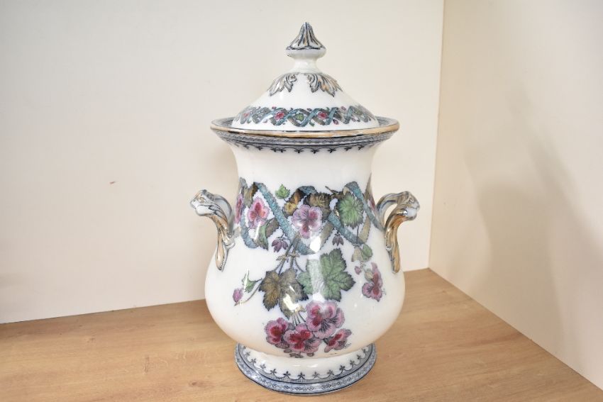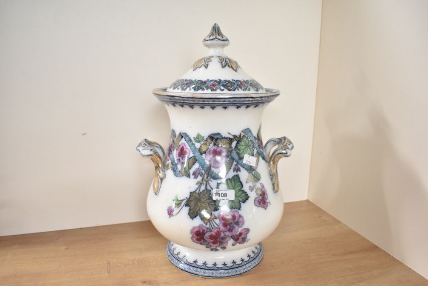 A large Victorian Edge, Malkin & Co-style transfer ware jar, featuring a foliate formed finial, twin ornate handles, and an elaborate floral, foliate and lace-like decoration, unmarked, 47cm, condition is consistent with age and wear, a large fixed crack is visible to the jars lid which goes from one side to the other.